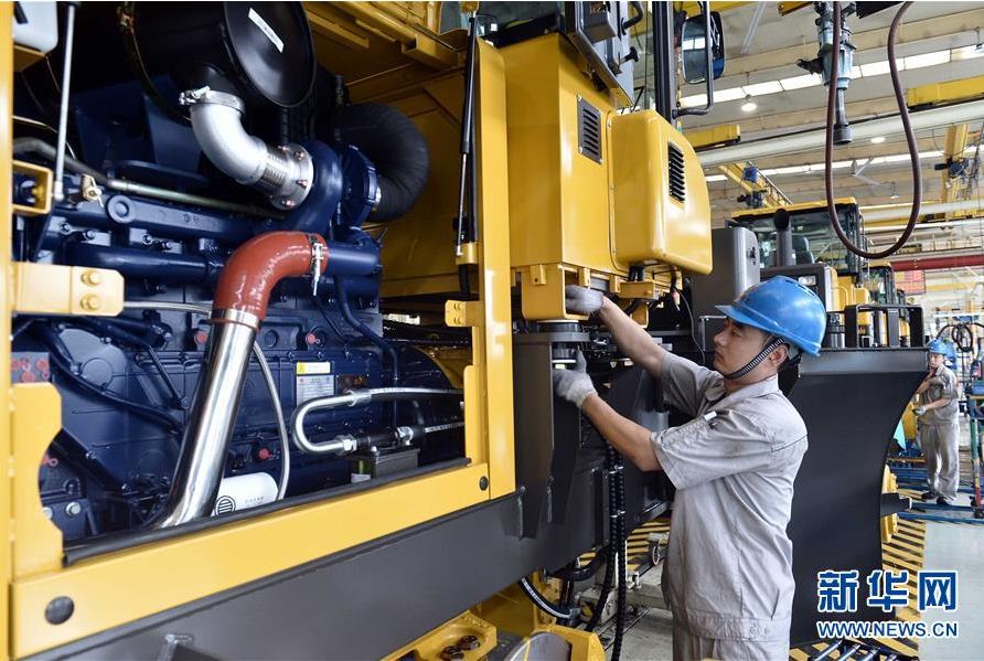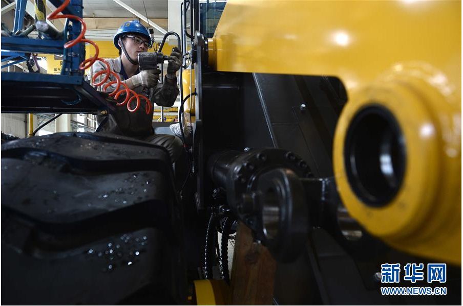 在山东南宫NG·28(中国)相信品牌力量工程机械有限公司,工人在装载机生产线作业